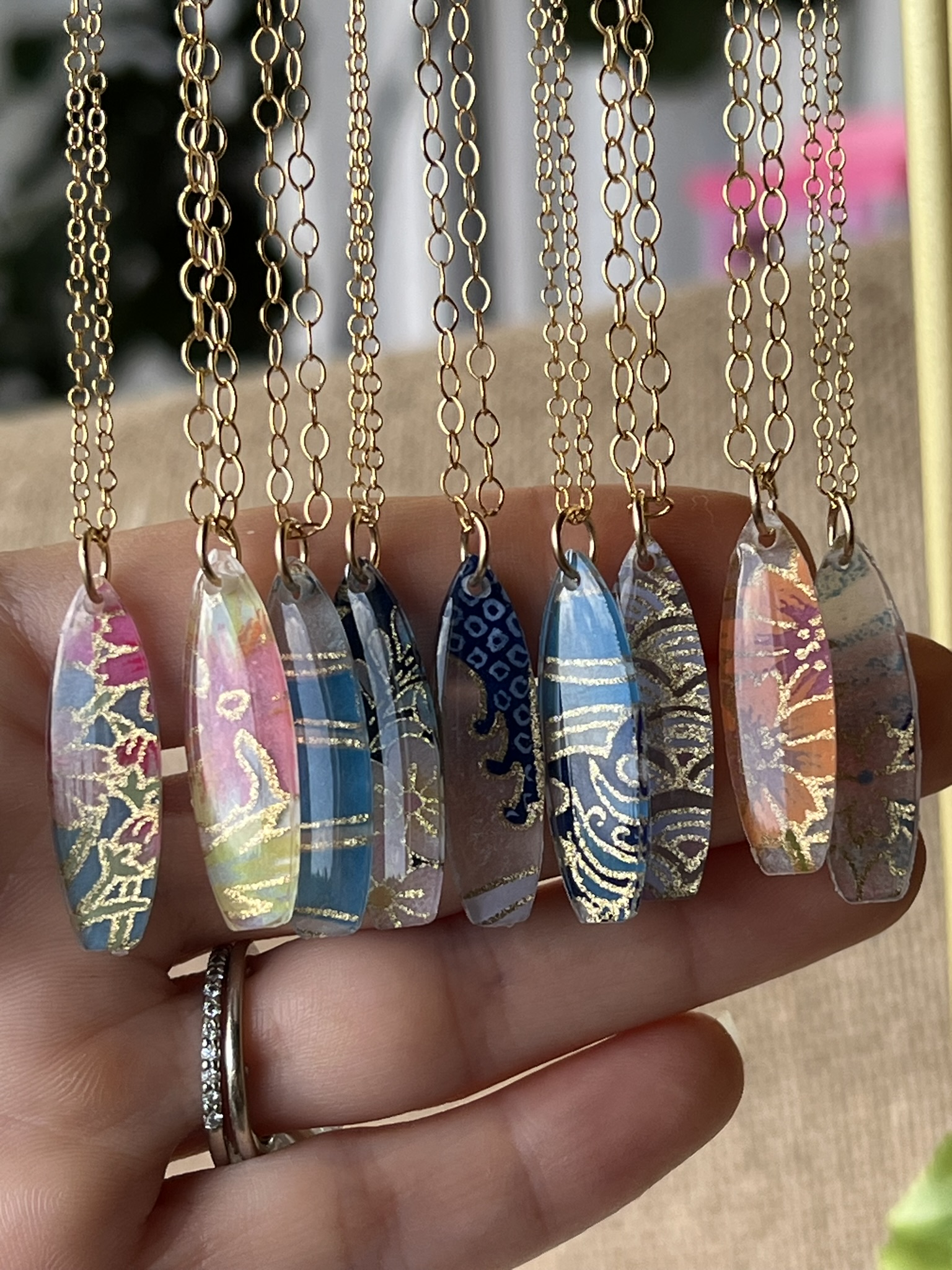 Kalea & Co. was founded in 2024. I hand craft resin jewelry with paper designs embellished with gold filled and sterling findings. The papers I use are specialty papers such as Washi paper, rice paper, etc. and am in the process of designing my own papers with Hawaiian designs.
