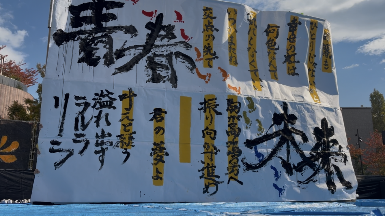 皆さま、こんにちは。関西大学文化会書道部です。音楽に合わせ、筆で大きな紙に動きのある書道を披露いたします。どうぞお楽しみください。